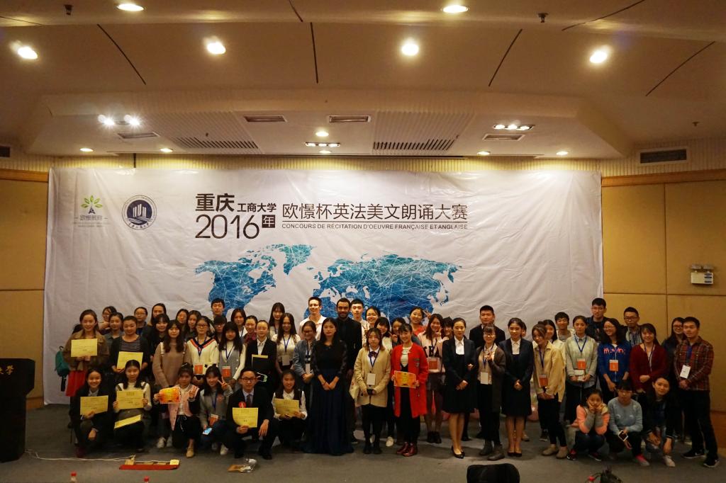 2016年11月4日,由重庆工商大学外语学院分团委主办,外语学院分团委学生会承办的重庆工商大学2016英法美文朗诵大赛决赛在博智楼7200顺利举办。外语学院李文英教授、刘晓远副教授、胡新宇副教授、罗媛媛老师、奉霞老师,外教JustinThomas、Raphaël担任大赛评委。来自全校各学院的30余名英法语爱好者参与本次比赛。