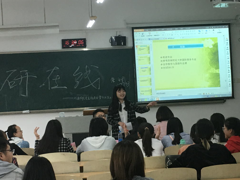 2017年4月21日下午,由党员服务站学风建设部主办的“考研在线”交流活动在主校区博智楼07212顺利开展。此次活动邀请到了数位拥有丰富考研经验的学长学姐来与对考研心存疑惑或满怀热情的学弟学妹们传道解惑。此外,学院丁亮老师和冉永琴老师以及党员服务站的部长及干事都参加了本次交流活动。