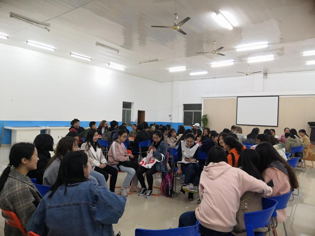 活动伊始,主持人用一口流利的英语向大家做了自我介绍并宣布活动的开始。紧接着,同学们在主持人、外教Cam的组织下,围绕主题“Flying through life——dreams that you take risks with”展开了free talk的活动。整个过程中欢笑声不断,大家通过分享自己的梦想,不仅增进了对彼此的了解而且也锻炼了自身的口语能力。就在大家还沉浸在对梦想的无限畅想中意犹未尽时,有趣的游戏开始了。首先开展的游戏叫“心有灵犀”:现场同学随机报名参与,五名同学一组共三组,第一个同学以自己的方式将卡片上的内容用动作表达给下一个同学,依次传递,最后一位同学根据自己的理解说出卡片上的内容。参与的同学有趣幽默的表演让大家忍俊不禁。每位同学都参与到了游戏中,同学们一边用动作传递信息,一边加深了对单词的理解,在玩耍中提升自己。第二个游戏是“你说我猜”。15位参与者分成三组,以组为单位团结参赛。主持人现场随机抽取卡片拿给台下的一位同学,台下的同学用英语描述卡片上的单词,优先猜出单词的小组积一分,分数最低的小组表演节目以作惩罚。台下的同学们积极参与,参赛同学尽全力作答,大家都乐在其中,而且也从中体会到了学习英语的乐趣。活动最后,来参加英语角的全体成员合影留念为此次英语角画上了一个圆满的句号。