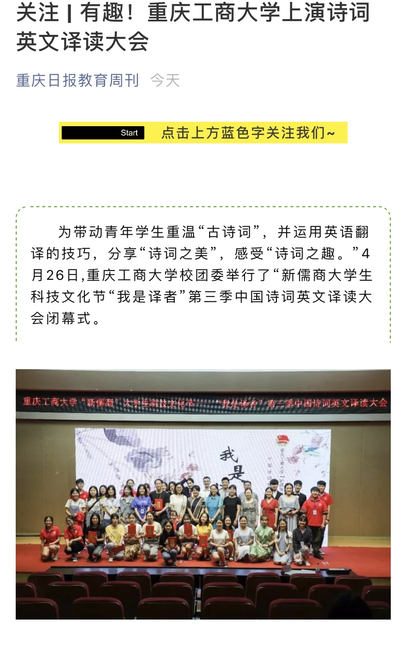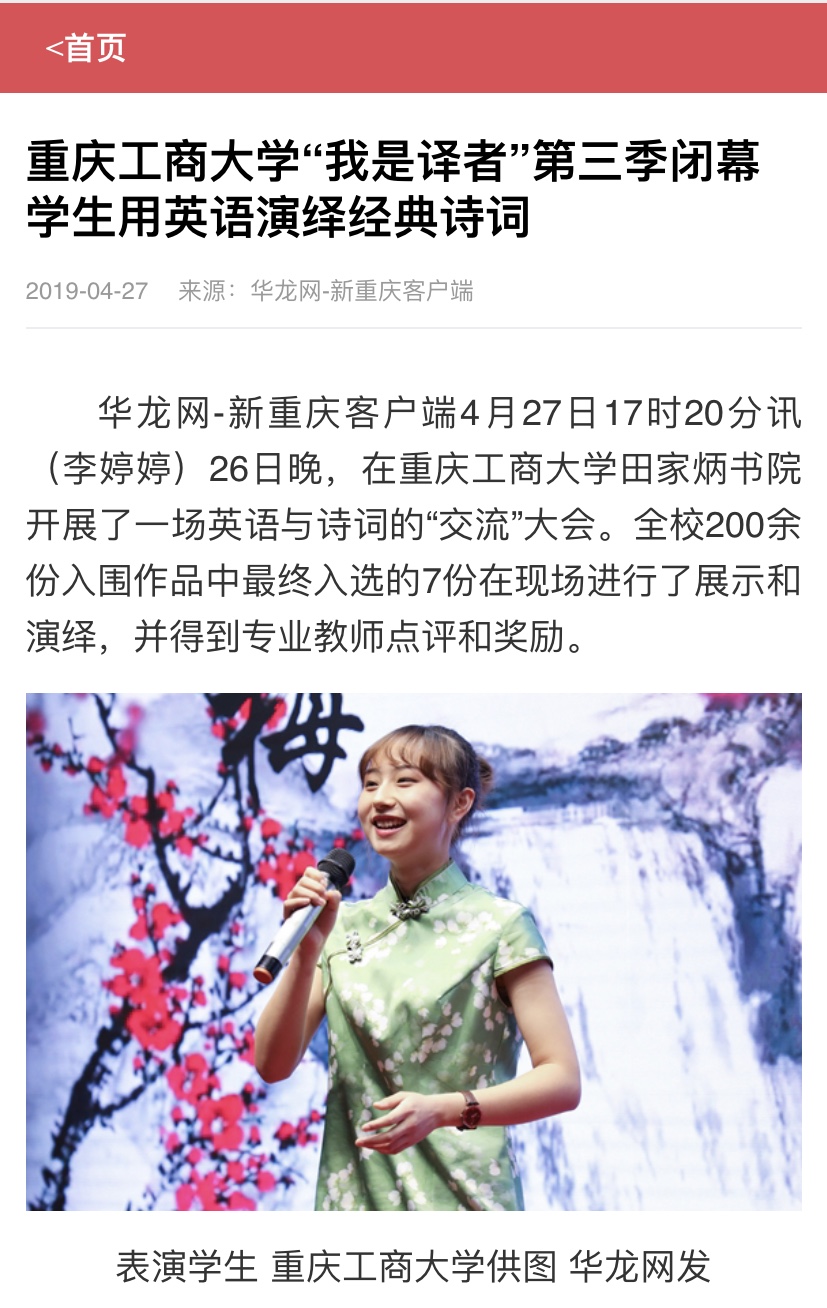 诗词有尽而意无穷,译读虽短却深入人心。“我是译者”自举办以来,反响热烈,吸引了众多热爱中国诗词文化的学生参加,为热爱英语的学生提供了一个展现自我的平台。第三季的“我是译者”活动经过四个月的比赛选拔和筹备,主办方从两百余份入围作品中评选出了12个获奖作品。本次活动也得到华龙网、重庆日报教育周刊的报道。