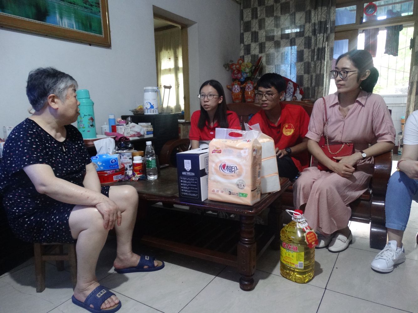 7月11日下午,在社区委员的带领下,外语学院分团委书记黄志婕老师同三名志愿者带着牛奶、纸巾、食用油等生活用品走访慰问了社区个别困难家庭。两位老人都已年过70,年迈体弱,依靠着自己的退休工资和政府补贴抚养着刚满9岁的孙女,爷爷更是腿脚不便,所以家里的奶奶承担了大部分的生活压力。看到志愿者们的到来,老人们很激动,热情地把志愿者们招呼进屋,志愿者们热情地陪着老人聊家常,询问他们的困难,奶奶主动向志愿者们分享了爷爷的参军经历,大家还一起畅聊社会新风尚,其乐融融。在走访慰问了困难群众后,在社区工作人员的带领下,志愿者带着小朋友们开始清洁社区街道,小朋友们都穿着整齐划一的社区志愿服务红马甲,手拿垃圾袋,穿梭在绿化丛间,在社区街道中形成了一道优美的风景线。熟悉社区街道后,志愿者们分组到社区中关爱空巢老人,与老人聊天谈心,使独居老人们感受到了社会大家庭的和谐与美好。