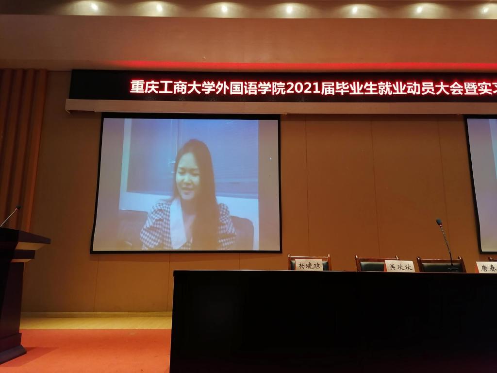 校友代表2019届毕业生曹倩雯和2020届毕业生杨爽受邀线上通话分享就业心得。杨爽对在校毕业生提出了两点建议,其一,尽快确定目标,那些仍在考研、考公务员或者直接就业之间摇摆不定的同学,首先应该静下心思考自己真正想要的是什么,然后为之努力奋斗;其二,趁年轻,勇敢拼。这个阶段是试错成本相对较低的,同学们应该勇于尝试,自信大胆地去追求自己喜欢的事情。随后,目前在非洲工作的曹倩雯同学也向大家分享了在非洲工作的近况,鼓励同学们努力提升专业水平,并欢迎有意向的同学到非洲工作。