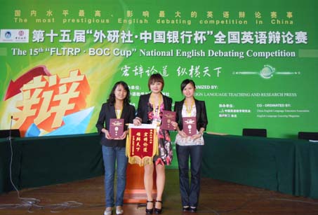 第十五届“外研社”杯全国大学生英语辩论赛刚刚落下帷幕。在这次国内水平最高、影响最大、最权威的英语辩论赛中,我校外语学院辩论队在主要由名牌大学出场的强大阵容中,通过艰苦拼搏,最终以总分15分的成绩,挺进全国32强,在全国129所高校中位居第23名,荣获全国二等奖。在过去五年的“外研社”杯全国大学生英语辩论赛中,我院选手都以不俗战绩连续荣获全国三等奖,此次喜获二等奖,刷新了我校历年来的参赛成绩,取得了历史性的突破。