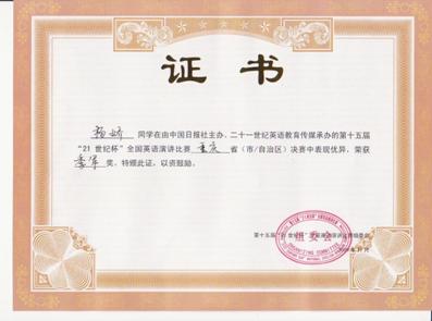 12月8日下午1:30,第十五届“21世纪杯”全国英语演讲比赛重庆赛区决赛在西南大学金桂学术报告厅隆重举行。杨娇同学凭借流利的口语和稳定的发挥征服了评委和在场观众;在即兴演讲中,其敏捷的思维、丰富的知识和娴熟的语言驾驭能力都充分展示了外语学院同学良好的英语文化功底;而在评委问答阶段,其淡定自如的表现显得泰然自若,得到了评委的一致肯定。最终力压众多出色选手,获得重庆赛区季军的好成绩。