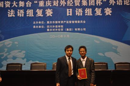 近日,2010国资大舞台“重庆对外经贸集团杯”外语论坛在四川外语学院拉开帷幕。在校团委和外语学院分团委组织下,我校外语学院和国际商学院共17名学生参加了法语组和英语组比赛。