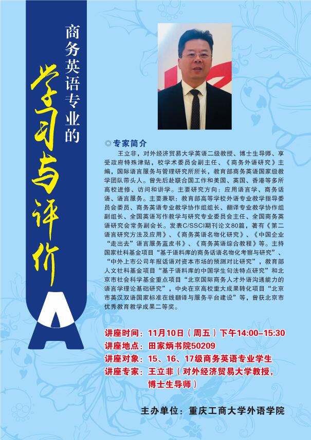 对外经济贸易大学王立非教授将于11月10日下午2点来我校田家炳209作学术讲座,欢迎全校师生参加!