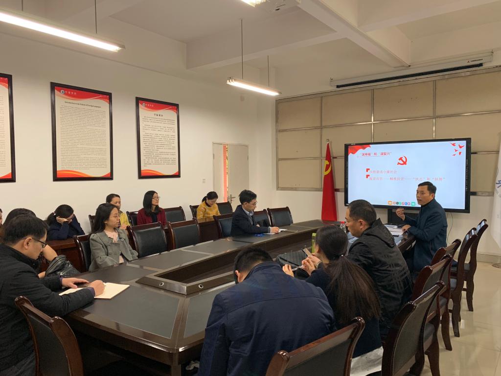 11月15日,外语学院党总支在田家炳50203会议室召开了“不忘初心、牢记使命”主题教育专题党课,学校主题教育巡回指导四组蒋年韬同志出席会议。全体教工党员参加了会议,会议由党总支书记陈晓东同志主持。
