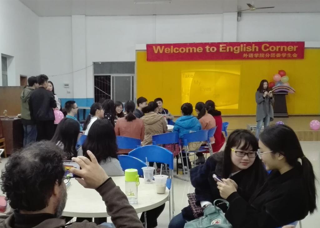 2016年3月16日18:30,外语学院第11期英语角在外语活动中心顺利举行。本次活动由外语学院分团委学生会学习部主办,本期主题为:Should Spring Festival Gala be kept as Chinese tradition or stopped?会计学院的谢添化和施梓含两位同学主持此次活动,出席的特邀嘉宾分别为:Justin、Kevin、Buzz和Som,各学院的英语爱好者都积极参与其中。